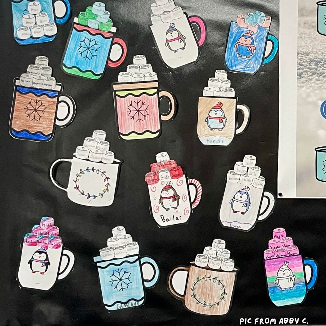 This snowflake review is a good bulletin board to hang and leave up the rest of the winter! Students write an infinitive in the middle of a snowflake, then conjugate the verb on the snowflake! You can also have your students decorate the snowflakes for added color!